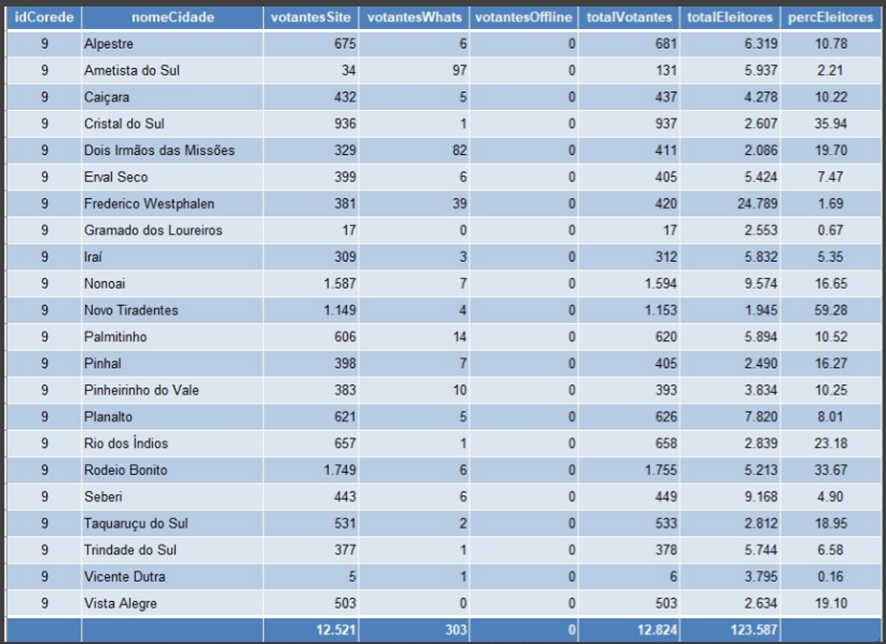 Dados preliminares, mostram a votação de cada municípios nos três primeiros dias de votação na Consulta Popular. Os dados oficiais, somente serão divulgados no dia 17 de outubro, juntamente com as demandas eleitas e os respectivos valores destinados para cada demanda, conforme definido pela região em Assembleia Regional Ampliada da Consulta Popular.