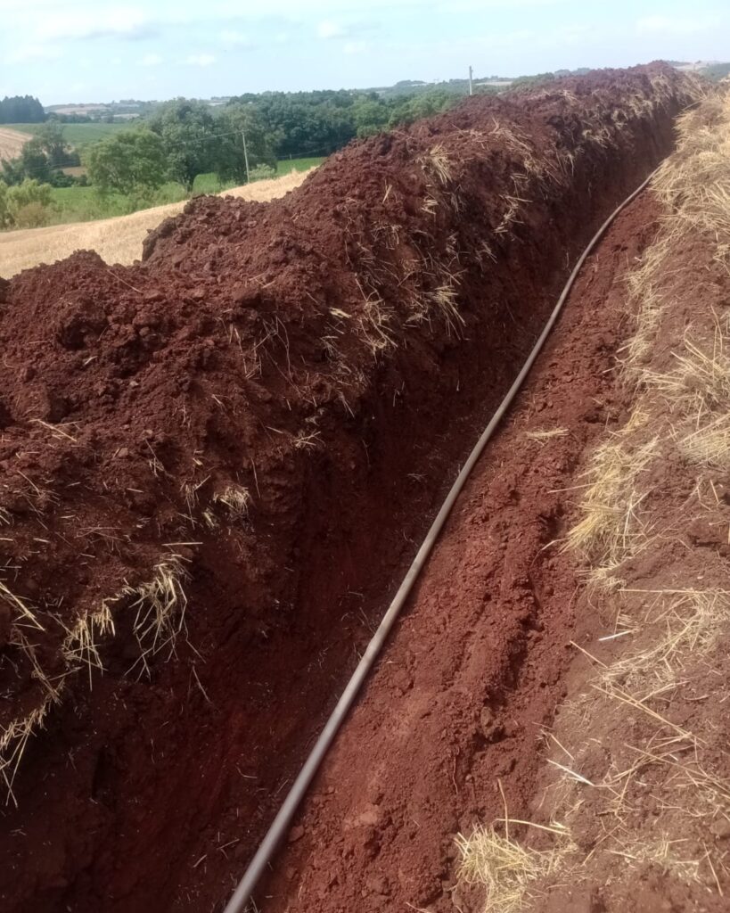 Foi finalizada a construção de uma nova rede de distribuição de água, ligada ao poço recentemente perfurado na propriedade do Sr. Berto Defante – Linha Alto Alegre. A obra contempla 340 metros de extensão, utilizando canos de 50mm, que já estão abastecendo a caixa localizada próxima à Cascalheira.