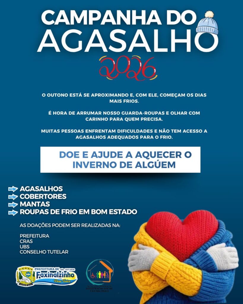 Ação solidária busca arrecadar roupas de frio e cobertores para famílias em situação de vulnerabilidade O município de Faxinalzinho já deu início à Campanha do Agasalho 2026, com o objetivo de arrecadar roupas de inverno, cobertores e mantas para ajudar famílias que mais precisam durante os dias de frio. As doações podem ser entregues na […]