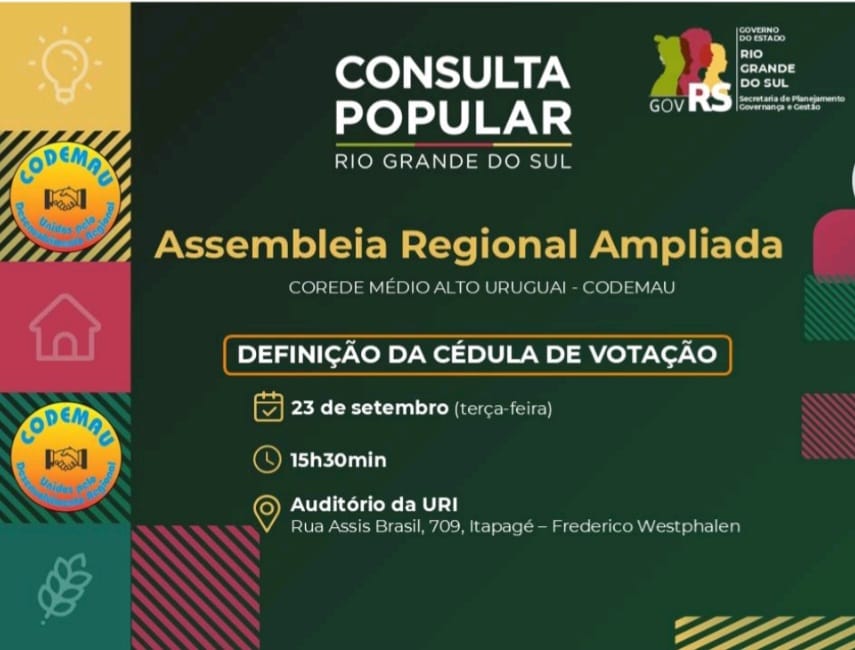 A data da próxima assembleia da Consulta Popular foi definida pelo Governo do Estado. Denominada de Assembleia Regional Ampliada, nesta assembleia serão definidas as seis demandas que irão para a cédula de votação deste ano.A Assembleia Regional Ampliada acontecerá no dia 23/09/2025, as 15:00 no Auditório da URI – Campus de Frederico Westphalen. Na fase […]